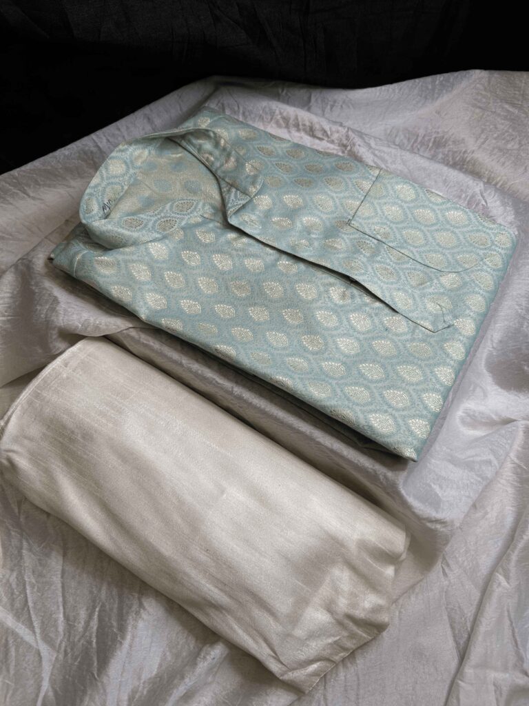 Men’s Sky Blue Jacquard Kurta Pajama Set with Silver Paisley Print