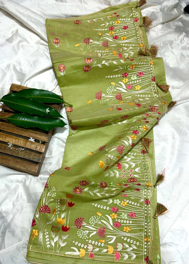 Cotton Linen Hand Embroidery Saree (Mehndi)