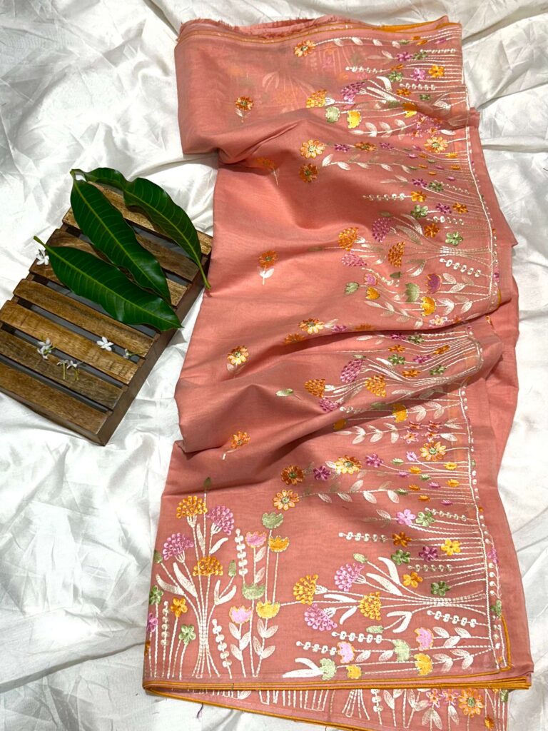 Cotton Linen Hand Embroidery Saree (Peach)