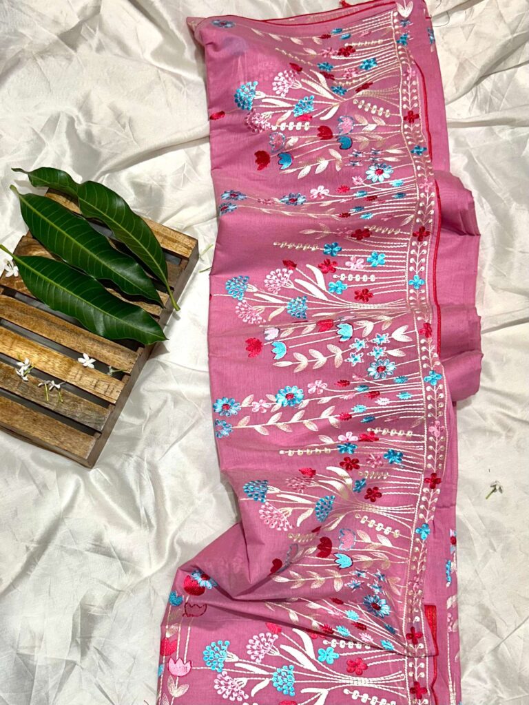 Cotton Linen Hand Embroidery Saree (Pink)
