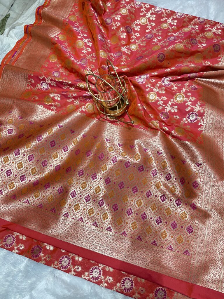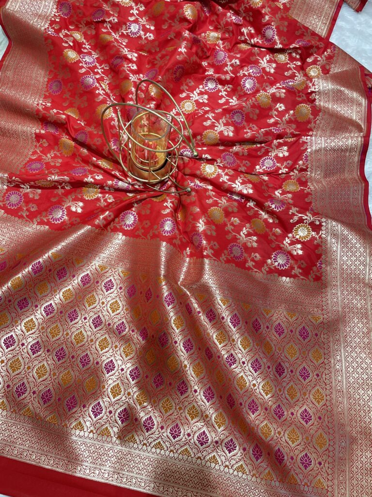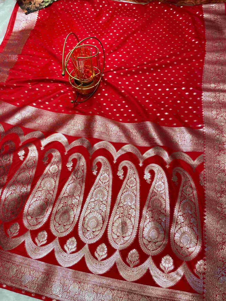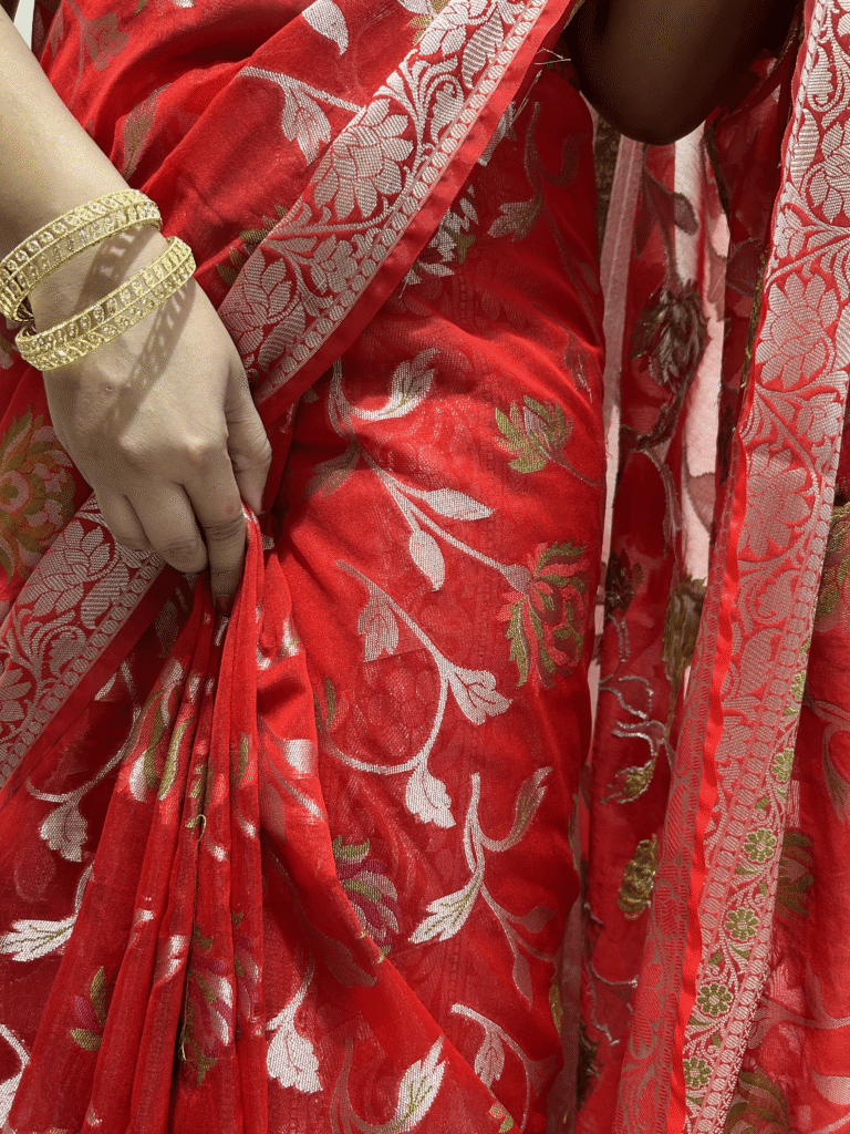 | COLOR | Rich bright red body with lustrous silver zari border |