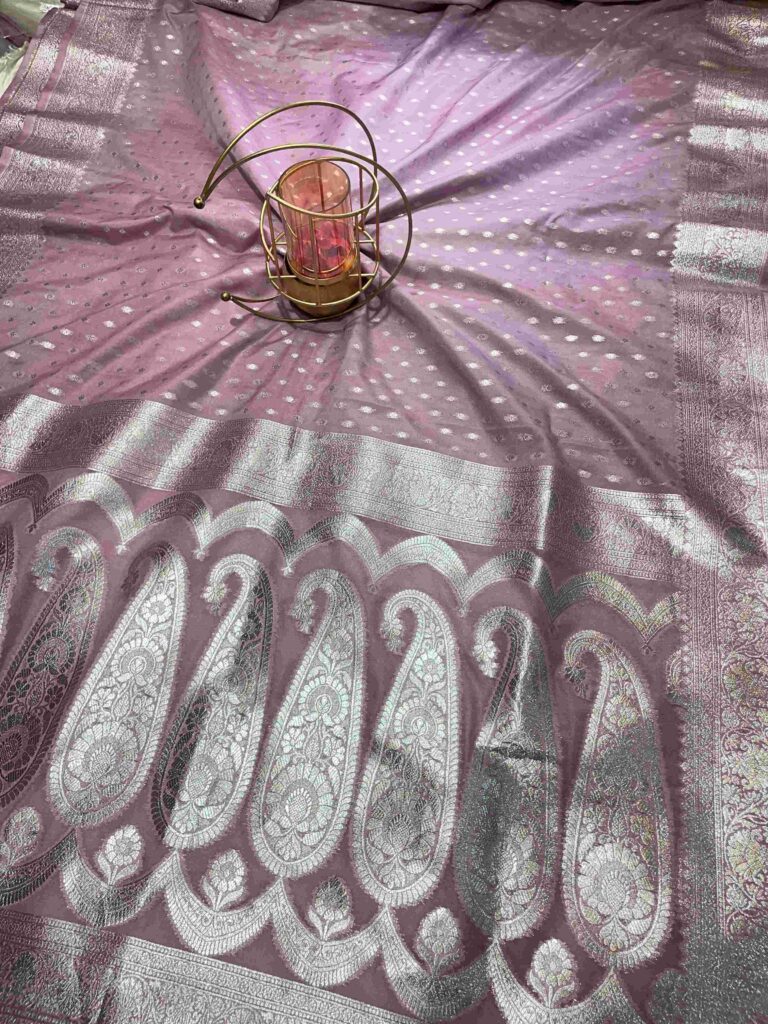 | COLOR | Delicate lavender purple body with lustrous silver zari border |