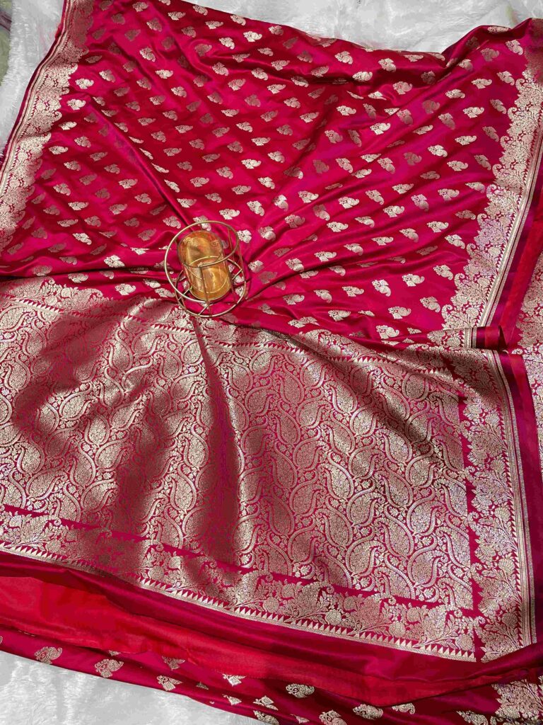 This luxurious pure katan mashru silk saree features a stunning fuchsia pink base adorned with elegant silver zari paisley buti motifs scattered throughout the body. The rich mashru silk fabric has a beautiful lustrous sheen and drapes gracefully. The highlight is the magnificent broad border and pallu, heavily embellished with intricate silver zari work in traditional Banarasi patterns featuring elaborate paisley designs arranged in rows. Multiple decorative bands with detailed craftsmanship create a regal finish, making this saree perfect for weddings and grand celebrations.