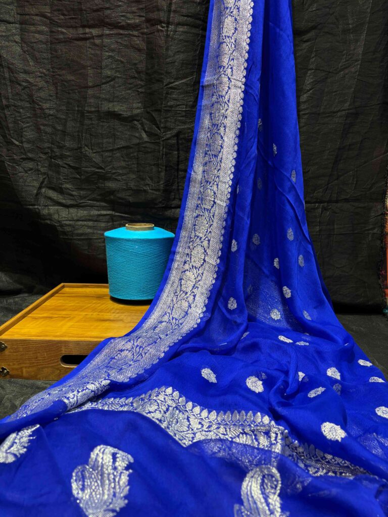 Royal Blue Pure Banarasi Georgette Silk Saree with Silver Zari Work