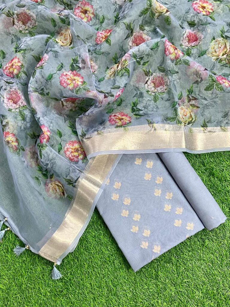 Grey Floral Pure Banarasi Print Unstitched Suit Set