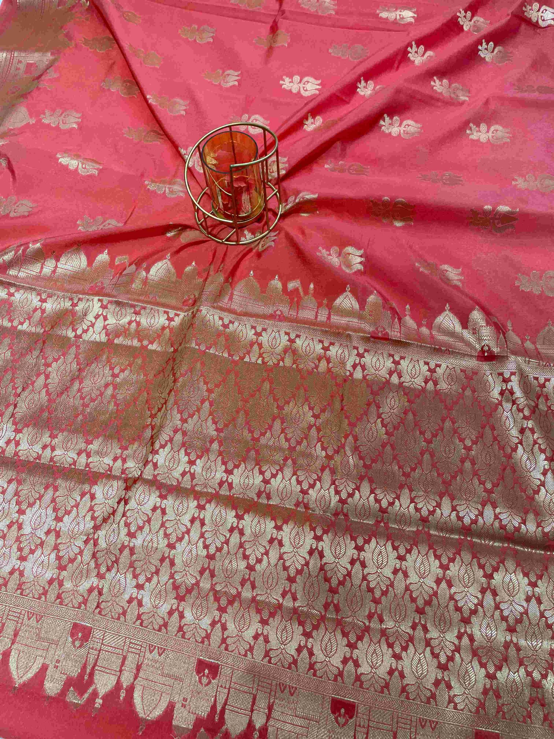 Coral Pink Banarasi Ghat Silk Cotton Saree with Gold Zari