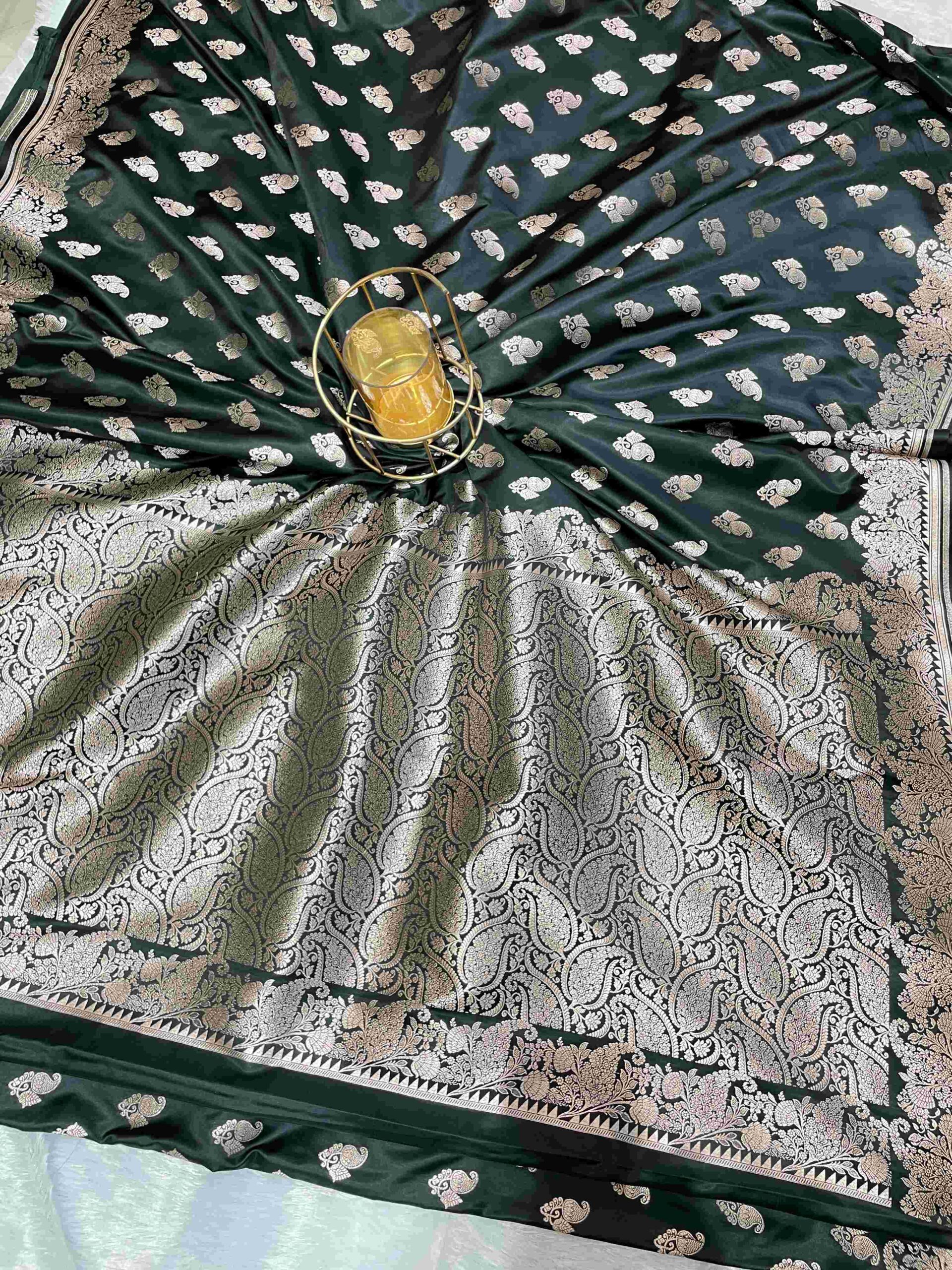 This stunning pure katan mashru silk saree features a rich dark green base adorned with elegant silver zari buti work scattered uniformly across the fabric. The lustrous mashru silk offers a beautiful sheen and luxurious drape that exudes sophistication. The border and pallu are richly decorated with intricate silver zari work featuring magnificent paisley motifs and traditional Banarasi patterns. The deep green color combined with shimmering silver zari creates a timeless and elegant appeal, making this saree perfect for weddings, festive celebrations, and special occasions.