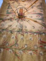 This extraordinary pure silk Banarasi saree features a beautiful golden yellow body adorned with exquisite hand-painted floral designs that showcase artistic craftsmanship. The body displays elegant painted motifs of stylized flowers with gracefully flowing green leaves accented with coral pink and orange hues, creating a stunning visual appeal. Complementing the hand-painted artwork are delicate gold zari floral butis scattered throughout the fabric. The saree boasts premium quality silk with a luxurious drape and natural sheen. The pallu showcases a mesmerizing wavy pattern in multicolor stripes featuring pink, green, and gold tones, interspersed with the same hand-painted floral motifs and gold zari work. The border features similar multicolored wavy stripes with gold zari embellishment and continues the artistic theme. Finished with traditional tassels on the pallu, this saree represents a perfect fusion of traditional Banarasi weaving with contemporary hand-painted artistry. Perfect for art lovers, cultural events, and special occasions, this unique piece is ideal for those who appreciate one-of-a-kind artistic sarees that blend traditional craft with modern aesthetics.