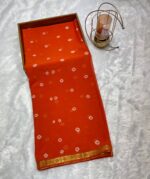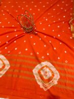 This exquisite pure silk Bandhani saree features a stunning bright orange base adorned with traditional white and cream bandhani (tie-dye) dotted patterns scattered elegantly across the entire body. The saree showcases authentic handcrafted bandhani work with small diamond-shaped motifs creating a beautiful scattered effect. The border and pallu are embellished with rich golden zari work in classic Banarasi style, featuring horizontal bands of intricate designs. The lustrous silk fabric drapes beautifully, and the vibrant orange hue combined with the contrasting white bandhani dots and golden border creates a perfect blend of traditional craftsmanship and festive elegance, making it ideal for special occasions and celebrations.