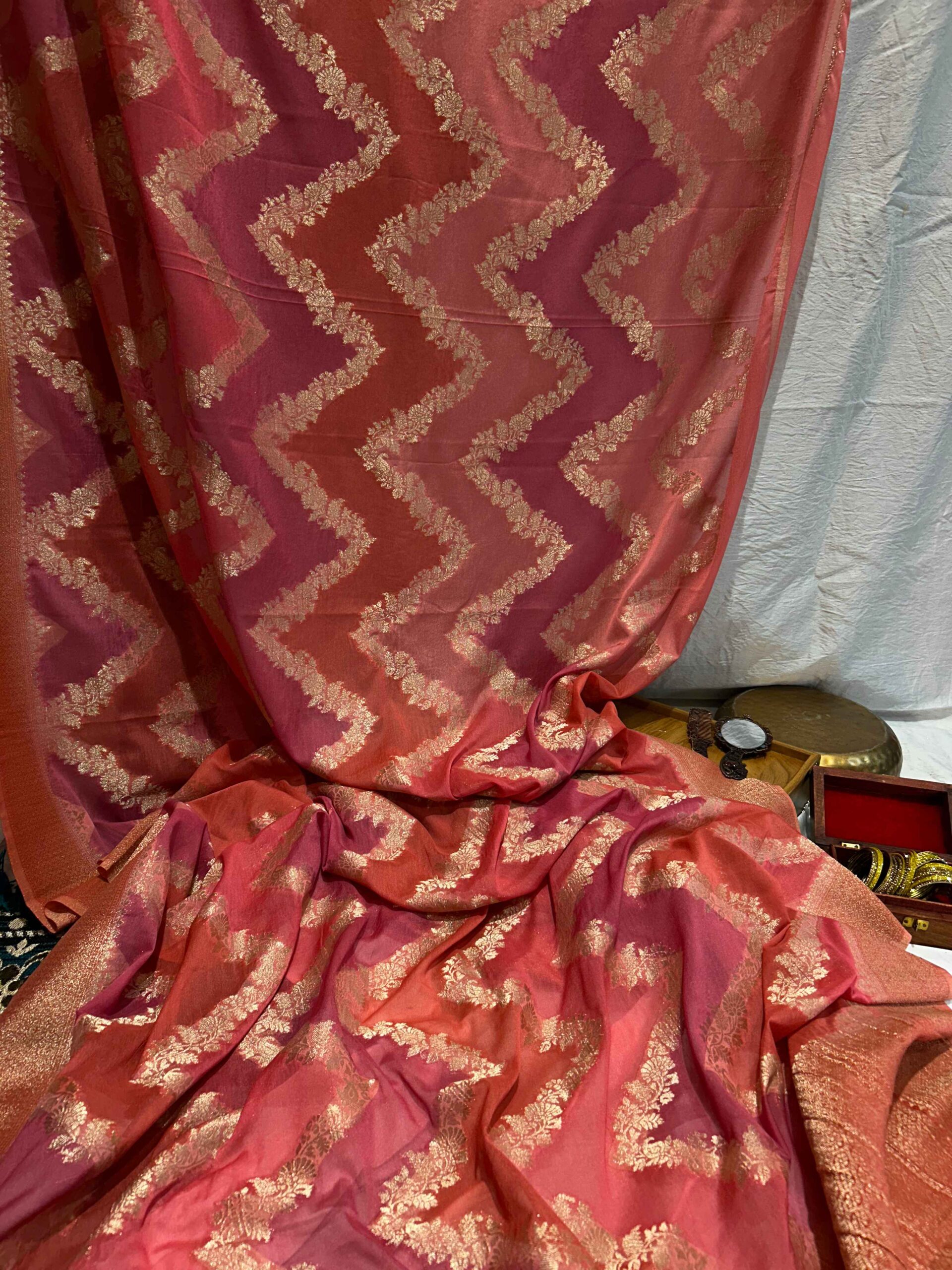 This stunning pure chiffon rangkat silk saree features a beautiful maroon pink base adorned with exquisite golden zari work throughout. The lightweight chiffon silk offers an elegant, flowing drape while the shimmering golden zari creates a rich, festive appeal. The body showcases a distinctive diagonal zigzag chevron pattern created by continuous golden zari work running across the entire fabric. This contemporary geometric design adds modern flair to traditional craftsmanship, with each diagonal band composed of intricate floral motifs and delicate zari work that catches the light beautifully.