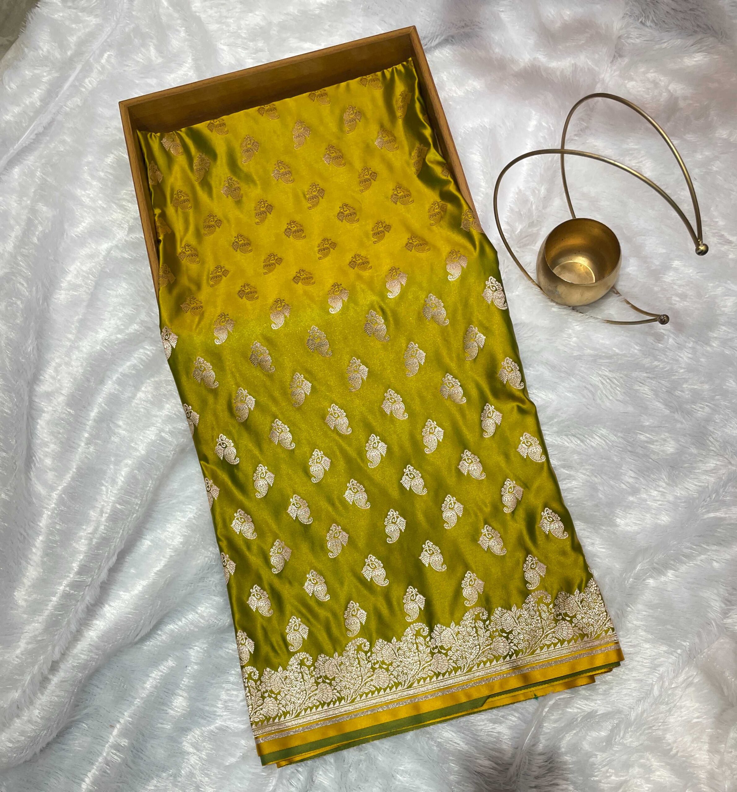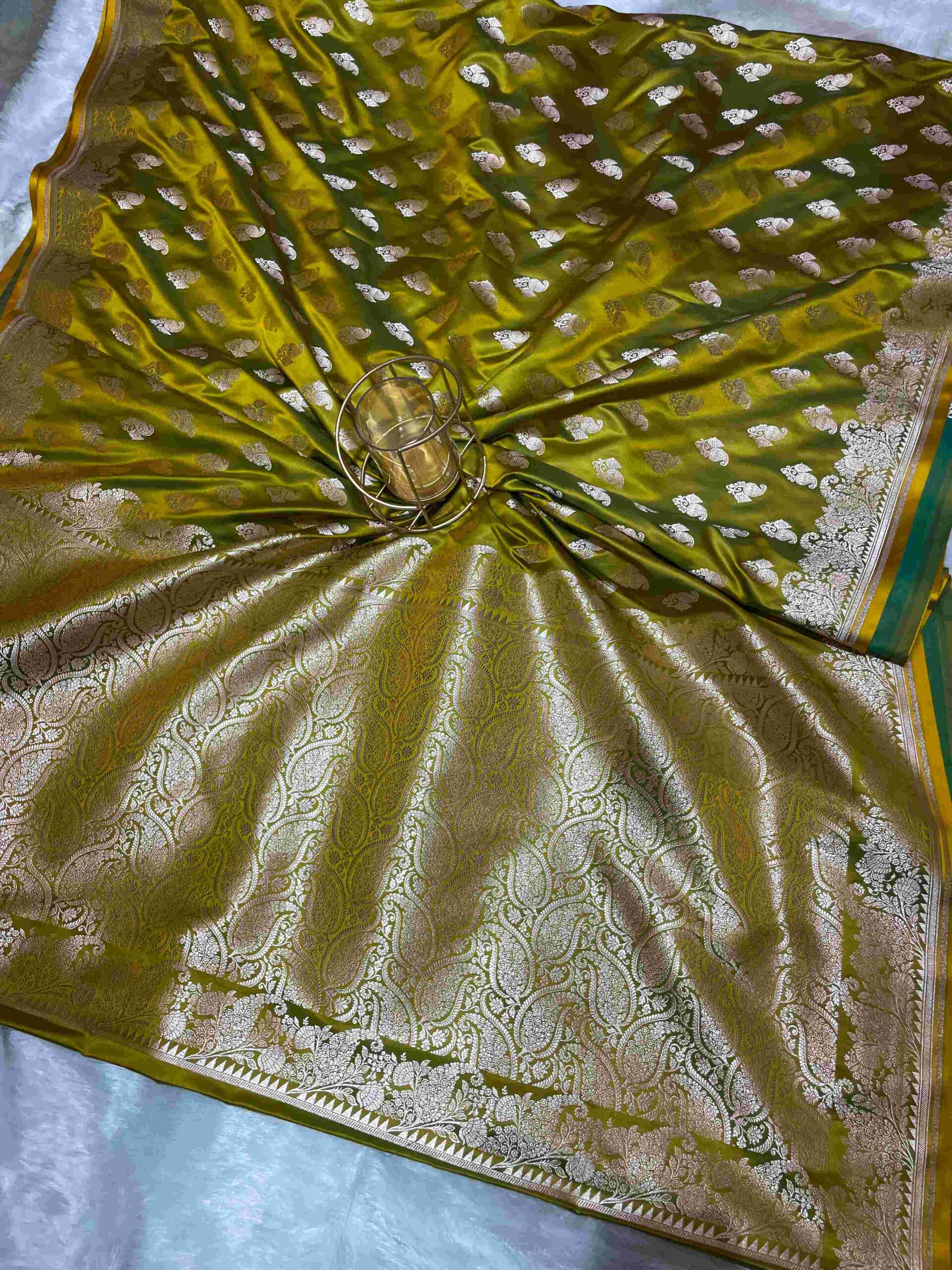 Olive Green Pure Katan Mashru Silk Saree with Silver Zari Work
