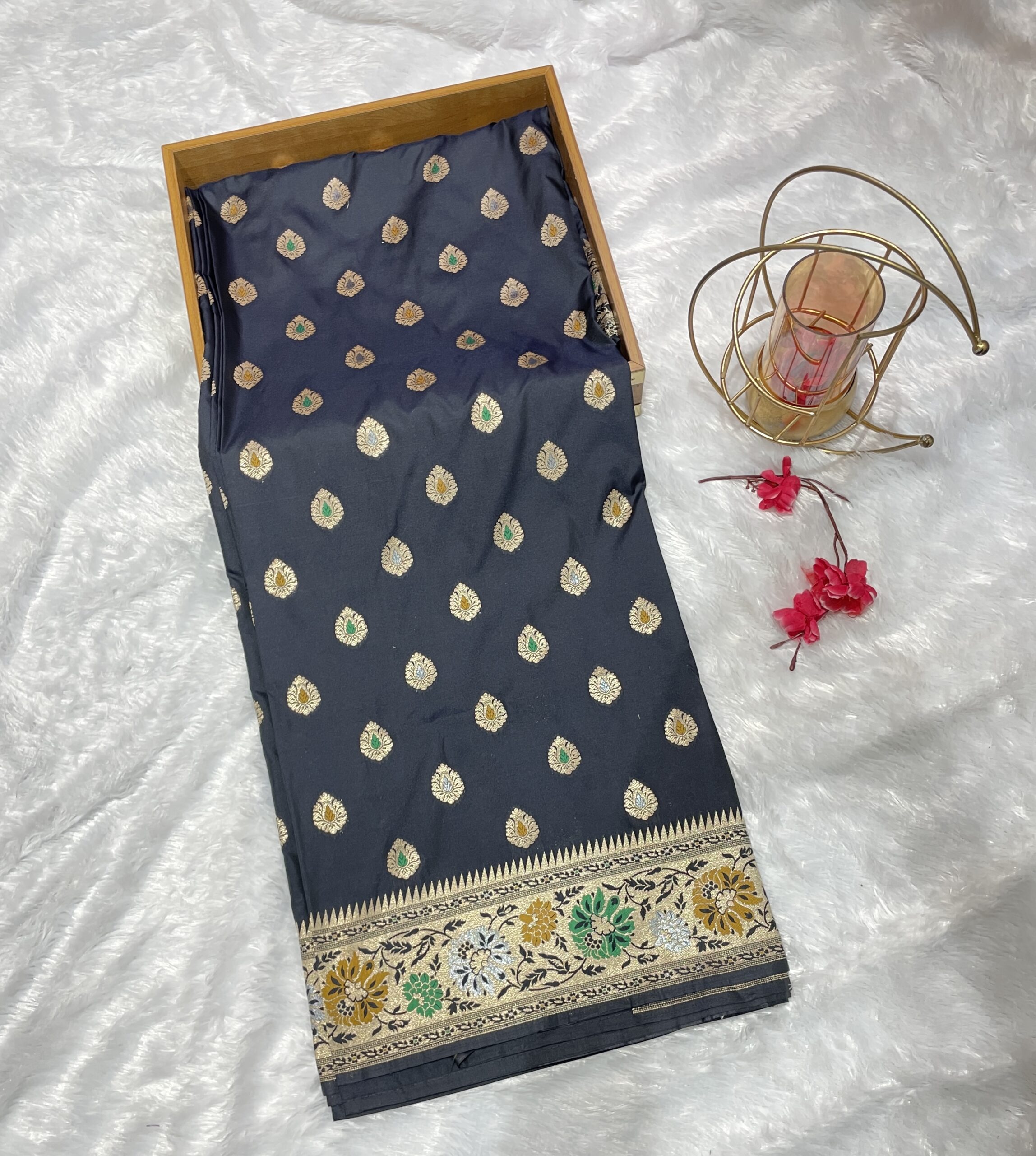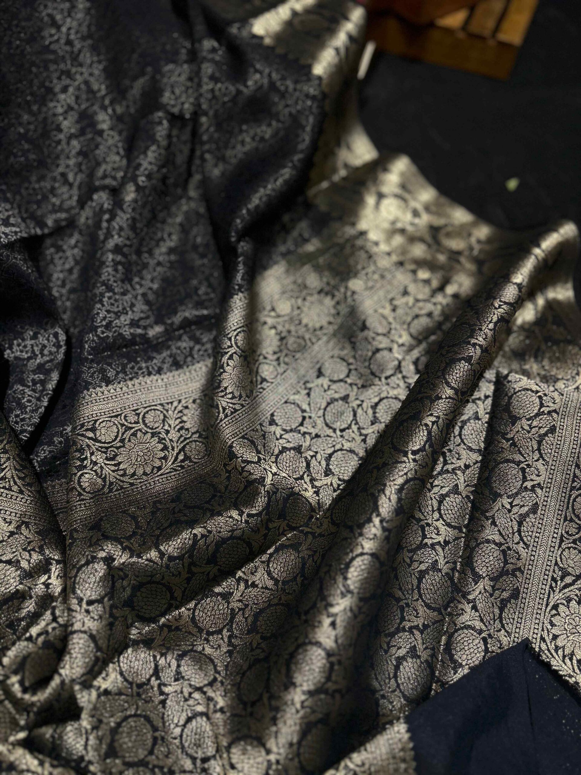Store garment in a muslin cloth in a dry environment, as the zari tends to react to the weather changes.