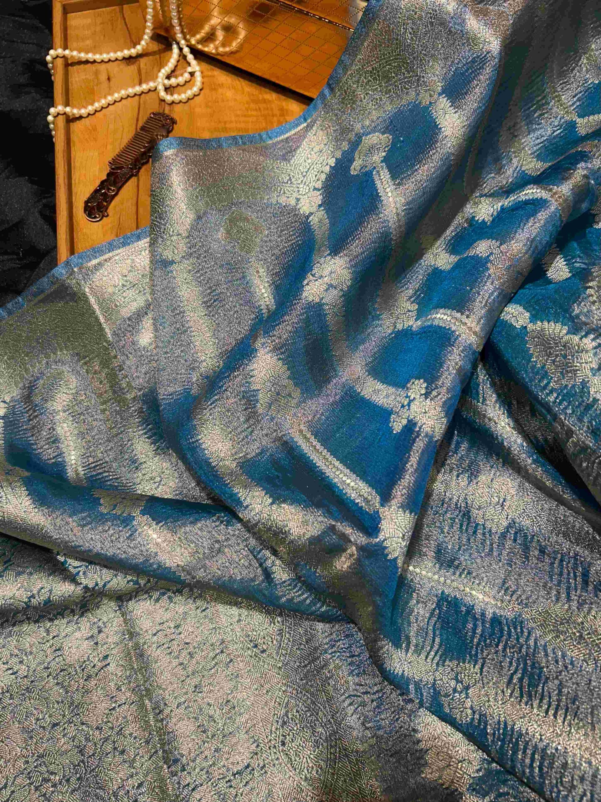 This stunning pure crush tissue silk saree showcases a gorgeous peacock blue base with mesmerizing silver and green metallic shimmer throughout. The fabric features an elegant crush texture with intricate woven patterns including traditional motifs of elephants and floral designs that create a captivating visual depth. The lightweight tissue silk drapes effortlessly while catching light beautifully with every movement, creating an iridescent effect. This saree comes without additional lace or border embellishments, letting the rich brocade weaving and lustrous fabric speak for itself. Perfect for weddings and grand festive celebrations.