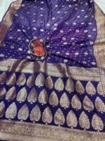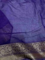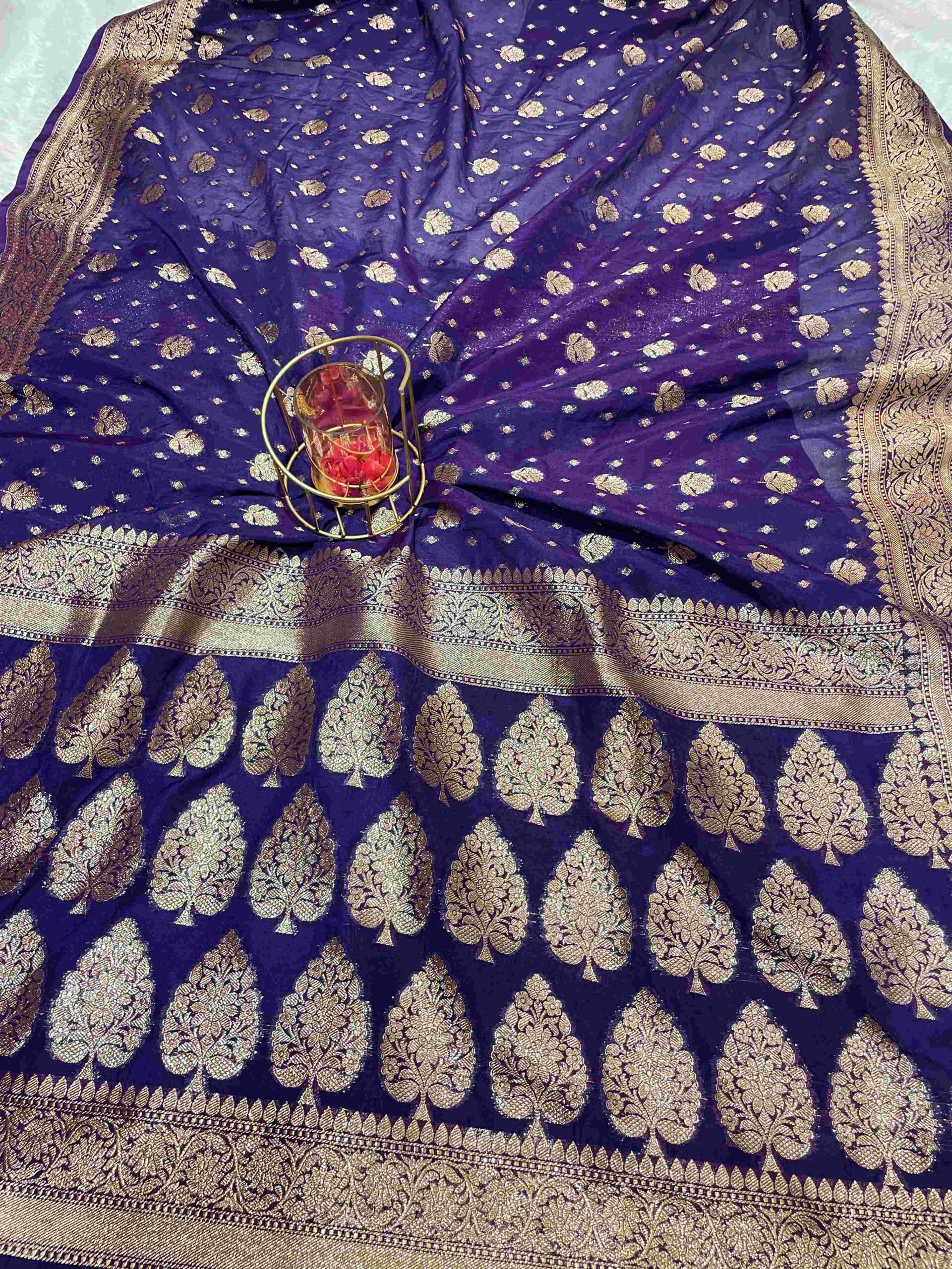 This luxurious pure georgette silk saree features a stunning deep purple base adorned with elegant silver zari floral buti motifs scattered throughout the body. The lightweight, flowing georgette fabric drapes beautifully and offers comfortable wear. The broad border and pallu showcase magnificent silver zari work with rows of intricate paisley motifs in traditional Banarasi style. Multiple decorative bands with elaborate floral and geometric patterns create a regal frame, making this saree perfect for weddings, festive celebrations, and special occasions.