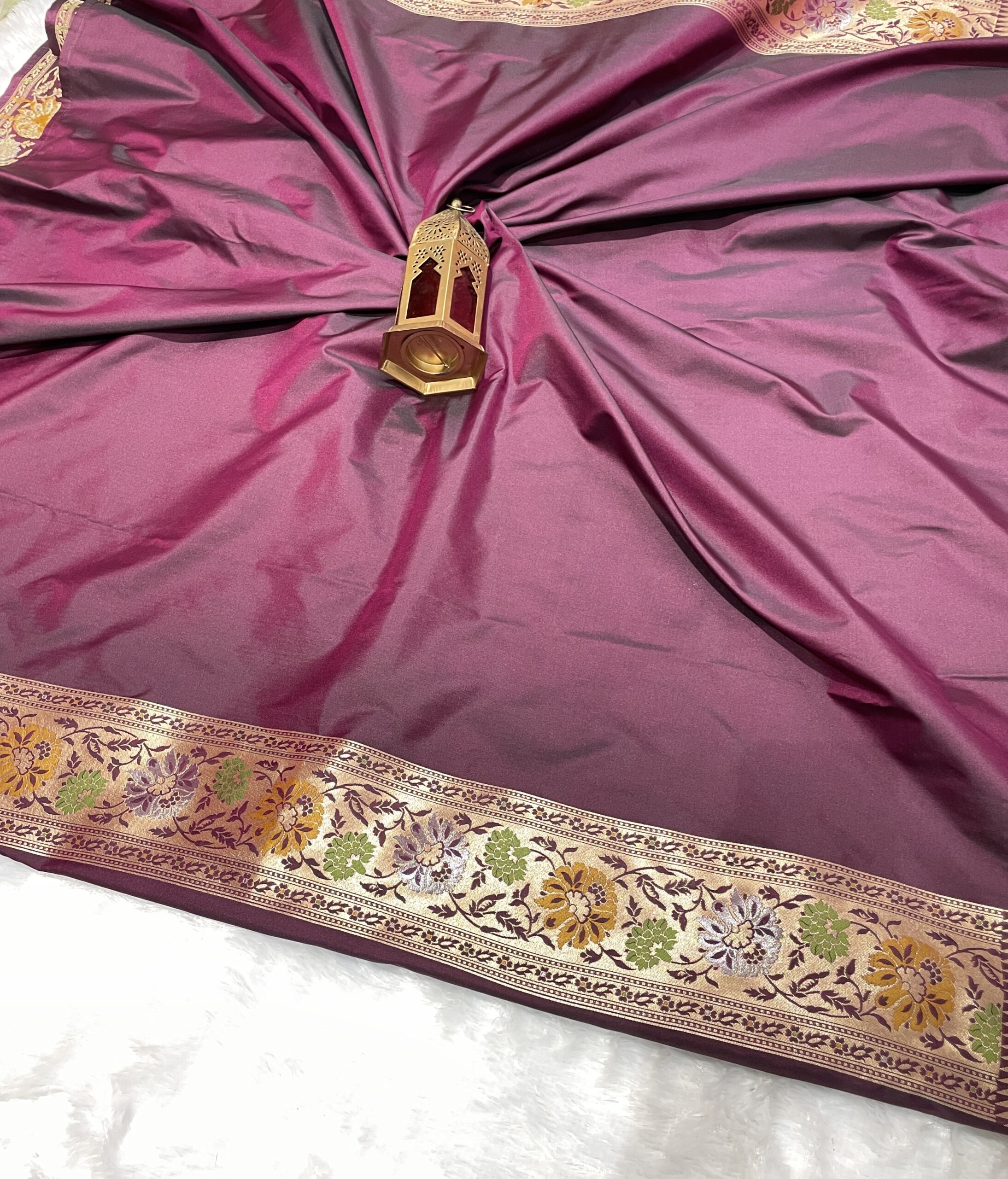 Dry clean only. Store garment in a muslin cloth in a dry environment, as the zari tends to react to the weather changes. Avoid spraying perfume directly on the garment. Air the textiles every few months.