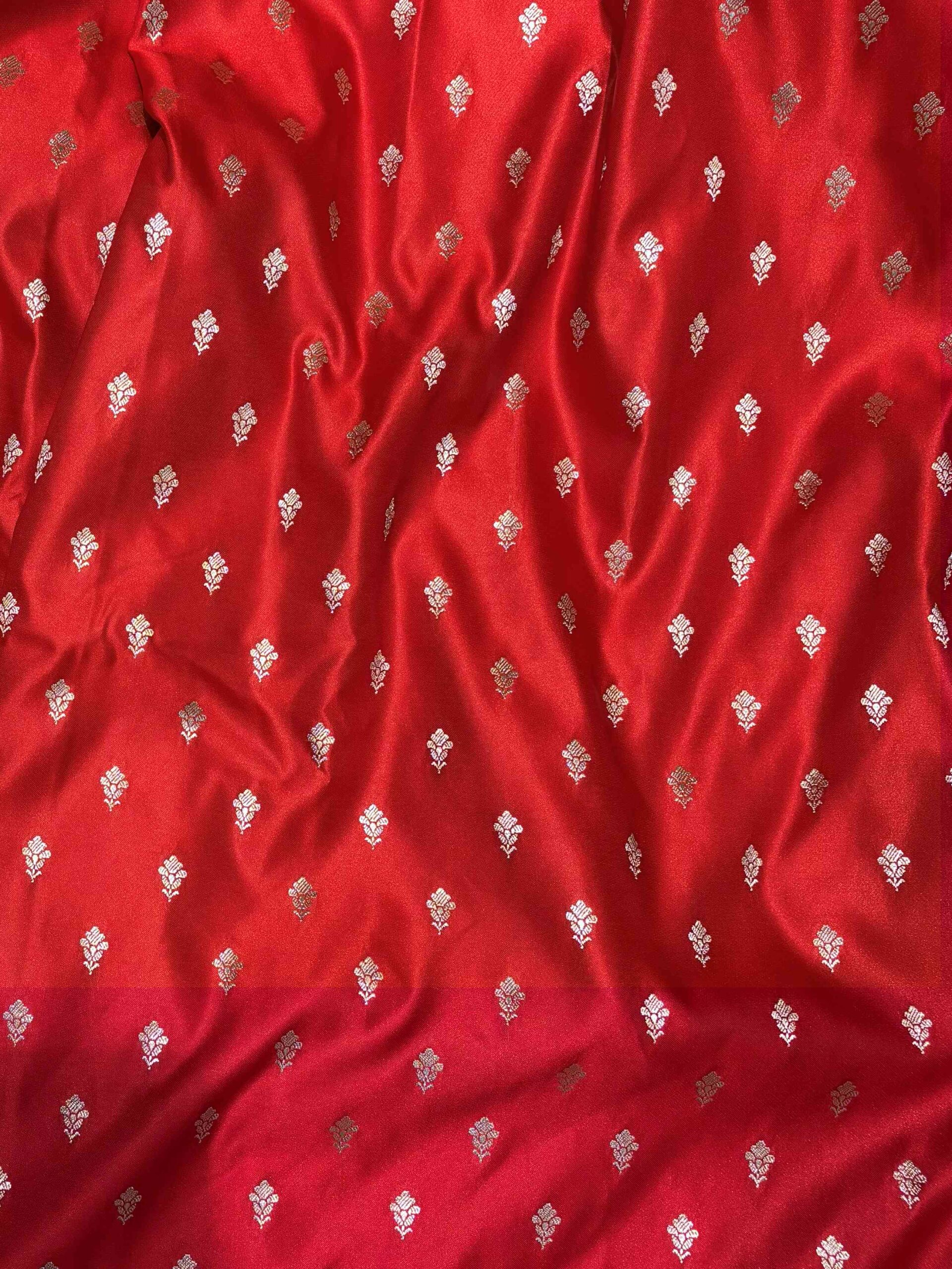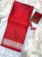 Be the first to review “Red Pure Katan Mashru Silk Banarasi Saree with Silver Buti” Cancel reply