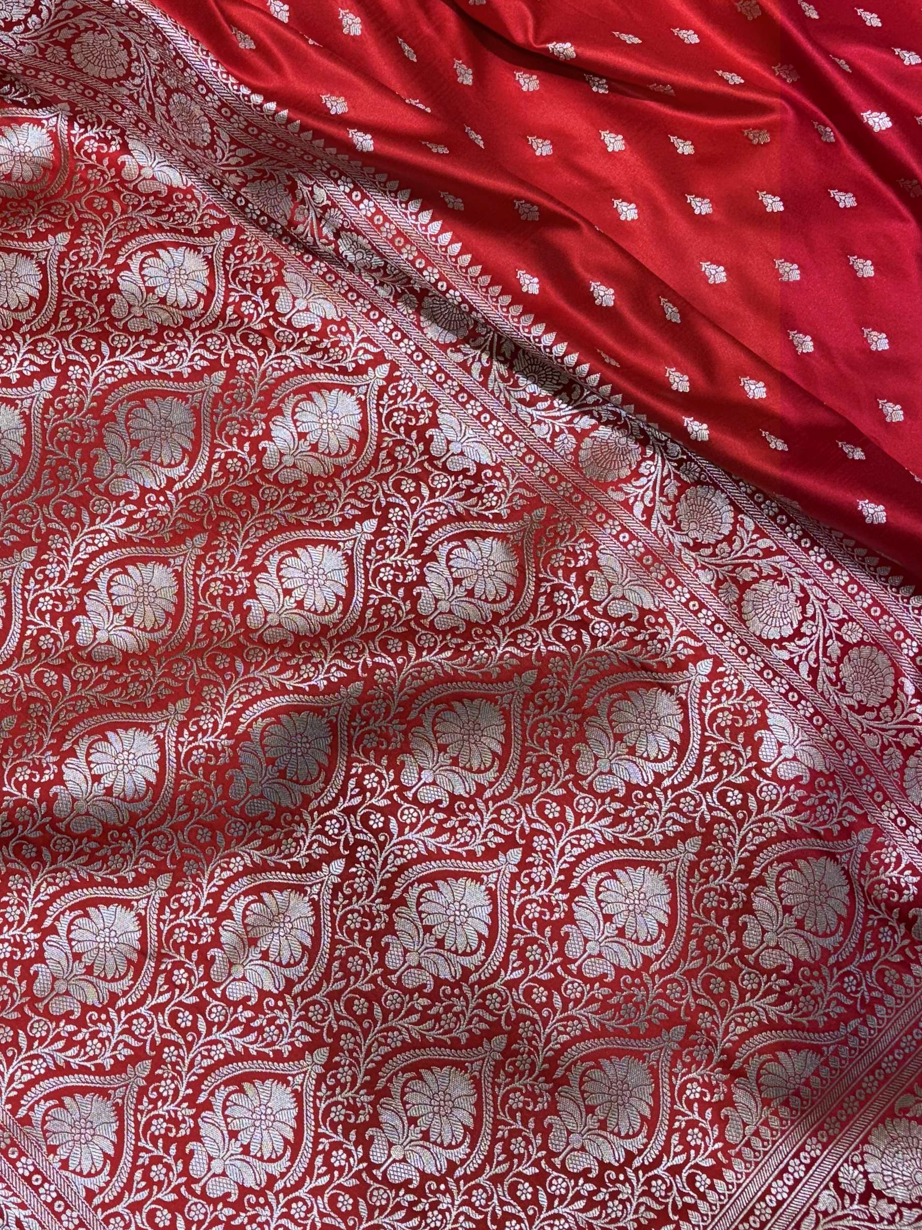 This stunning pure Katan Mashru silk Banarasi saree features a vibrant red body adorned with elegant silver zari buti work scattered beautifully throughout the saree. The Mashru silk gives the saree a gorgeous lustrous finish that catches light beautifully. The saree is finished with an exquisite wide silver zari border featuring intricate traditional Banarasi patterns, including elaborate floral motifs, circular medallions, and paisley designs that create a regal appearance.