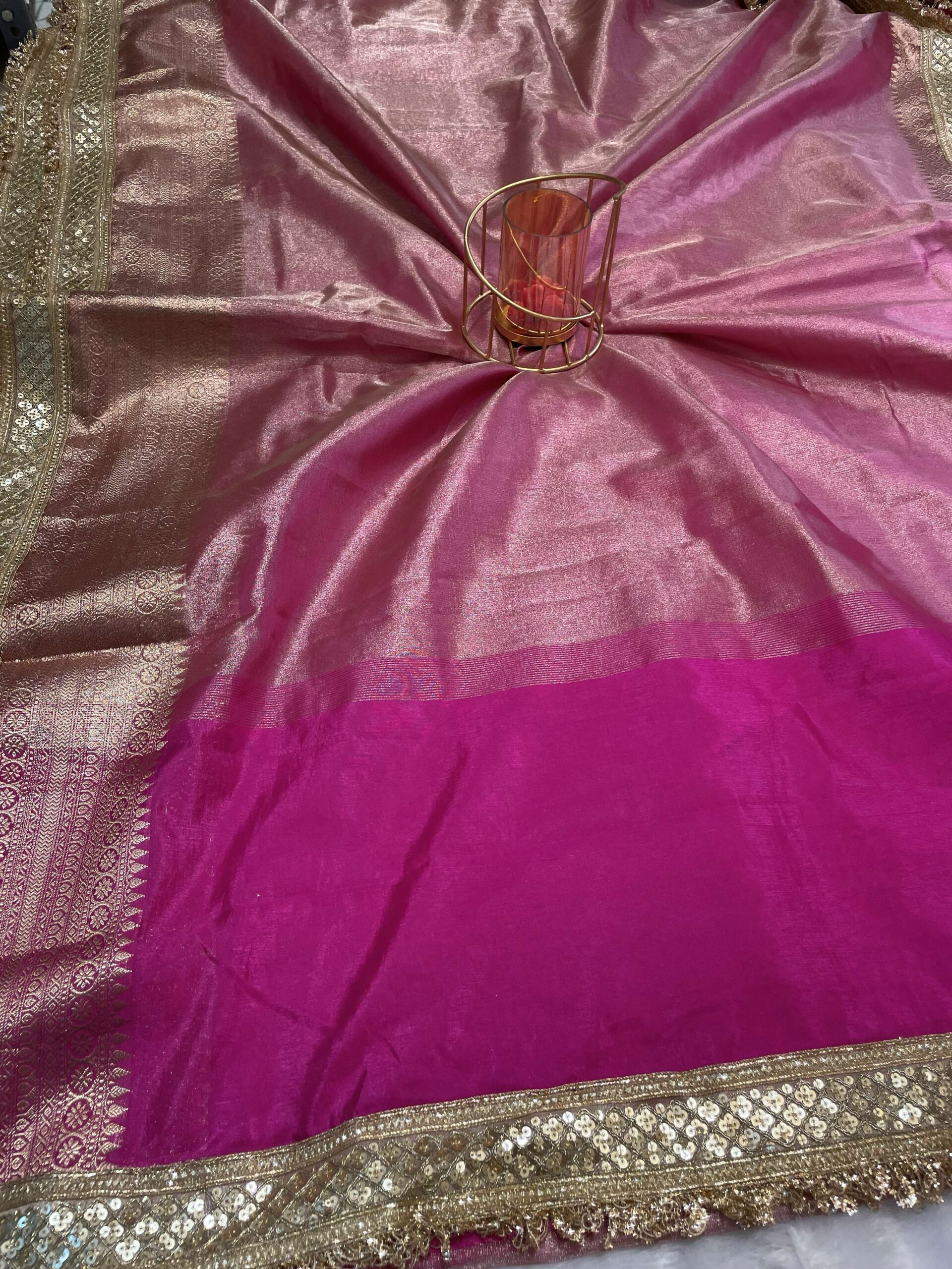 This breathtaking tissue silk saree features a stunning rose gold base with an extraordinary iridescent quality that creates a magical play of colors. The fabric shifts between rose pink, copper, purple, and golden tones as it catches the light, giving it a truly mesmerizing appearance. The saree is finished with a rich golden zari border with intricate sequin detailing that adds royal elegance. Wide golden zari border with elaborate patterns and sequin embellishments, matching pallu with traditional craftsmanship