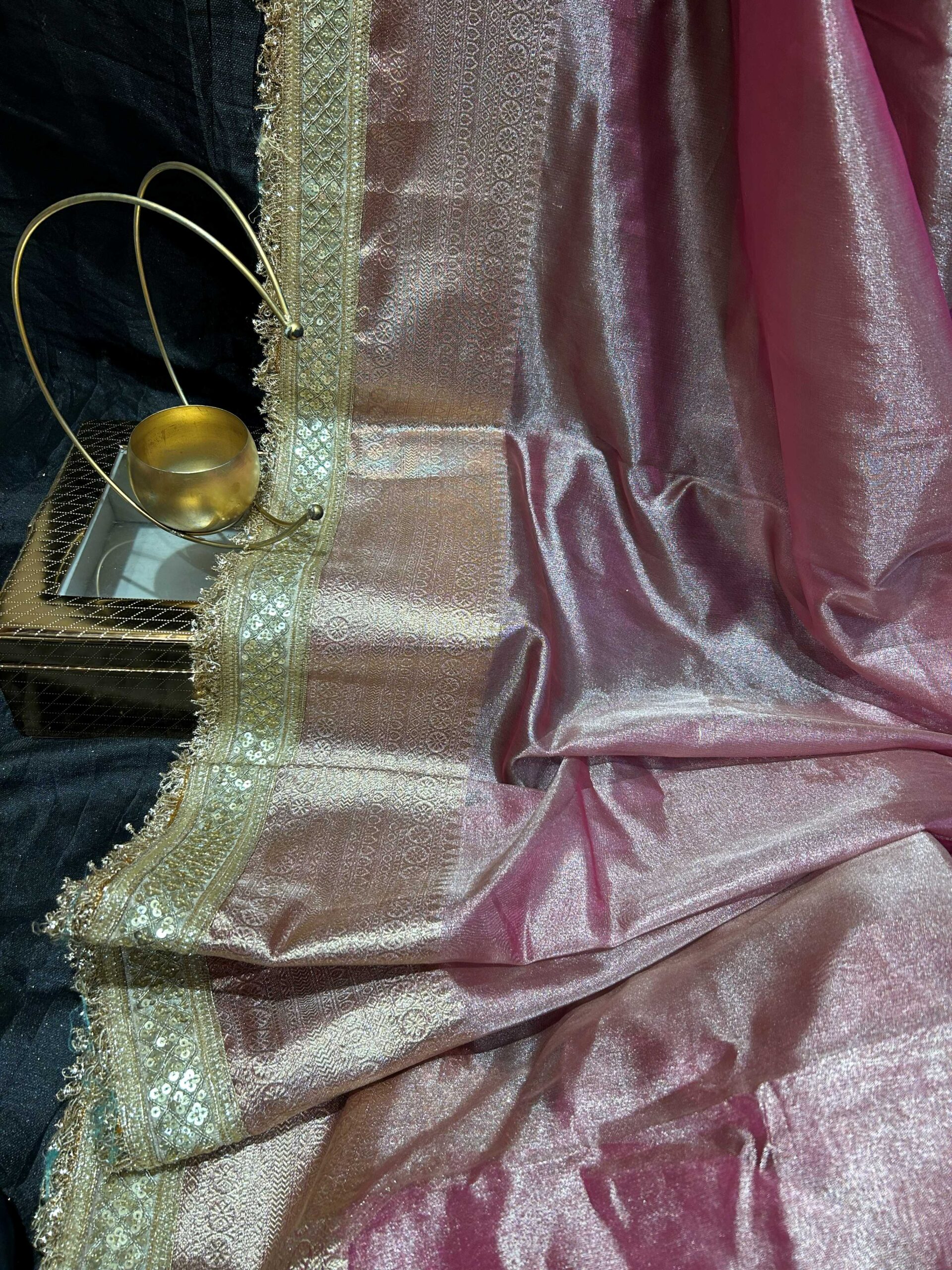Rose Gold Tissue Silk Saree with Golden Zari Border