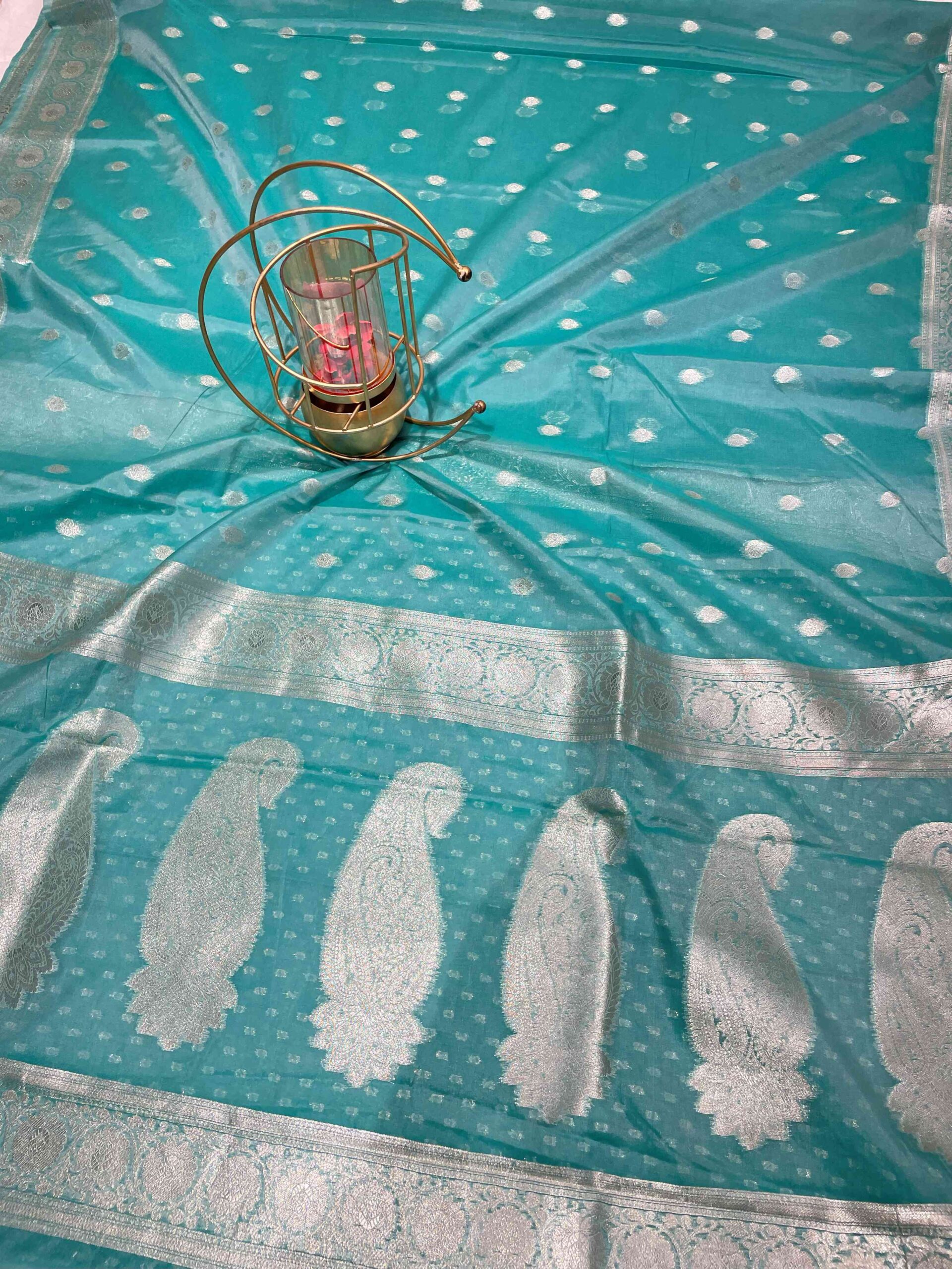This elegant cotton linen silk saree features a soothing sea green body adorned with delicate silver zari buti work in circular motifs evenly distributed throughout the saree. The fabric has a subtle sheen that adds grace to the overall look. The saree is beautifully finished with a silver zari border featuring intricate circular medallion patterns that complement the body design perfectly. Silver zari border with traditional circular and floral motifs