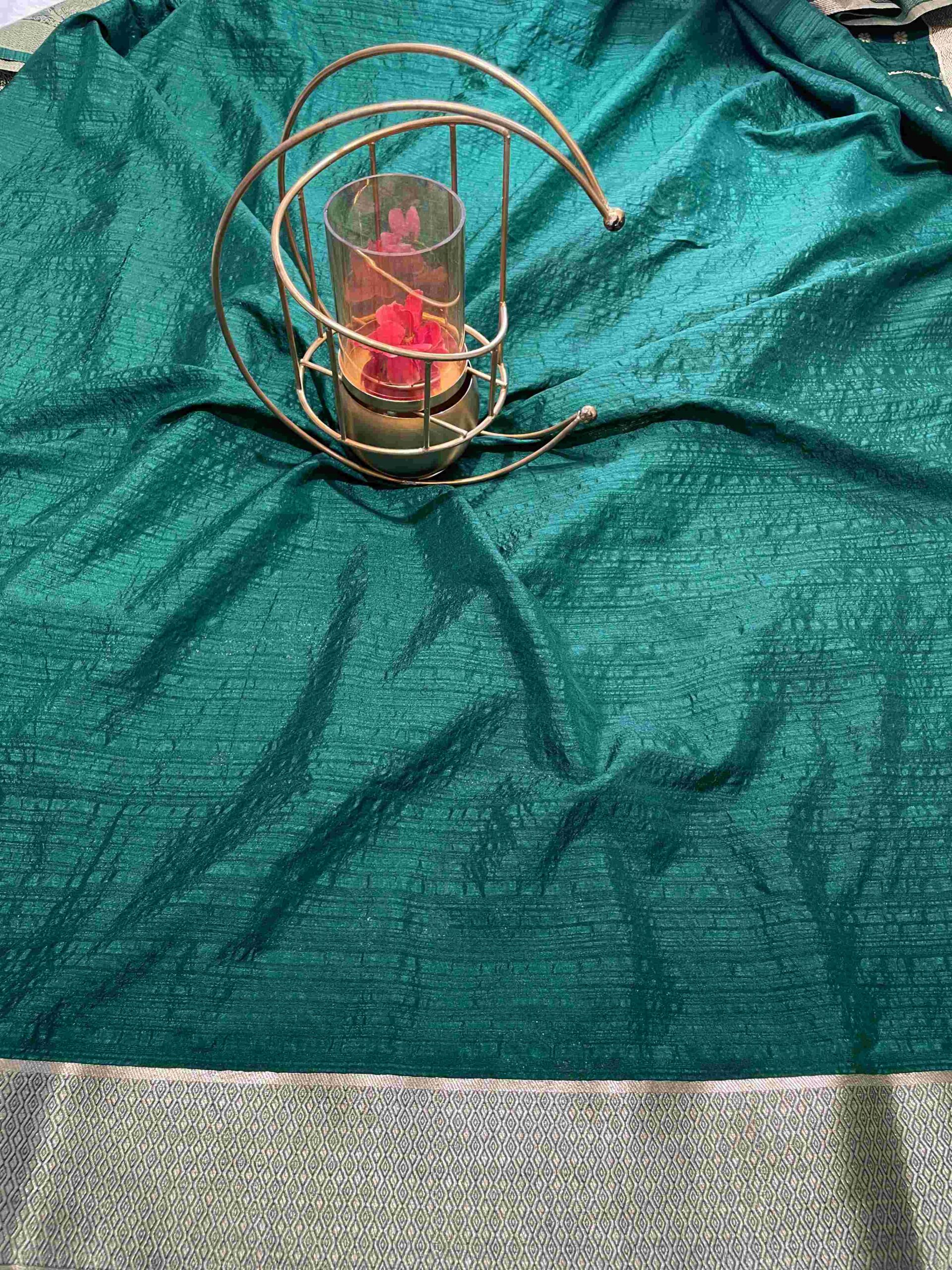 COLOR Rich Teal Green body with elegant silver zari vertical pattern and golden border