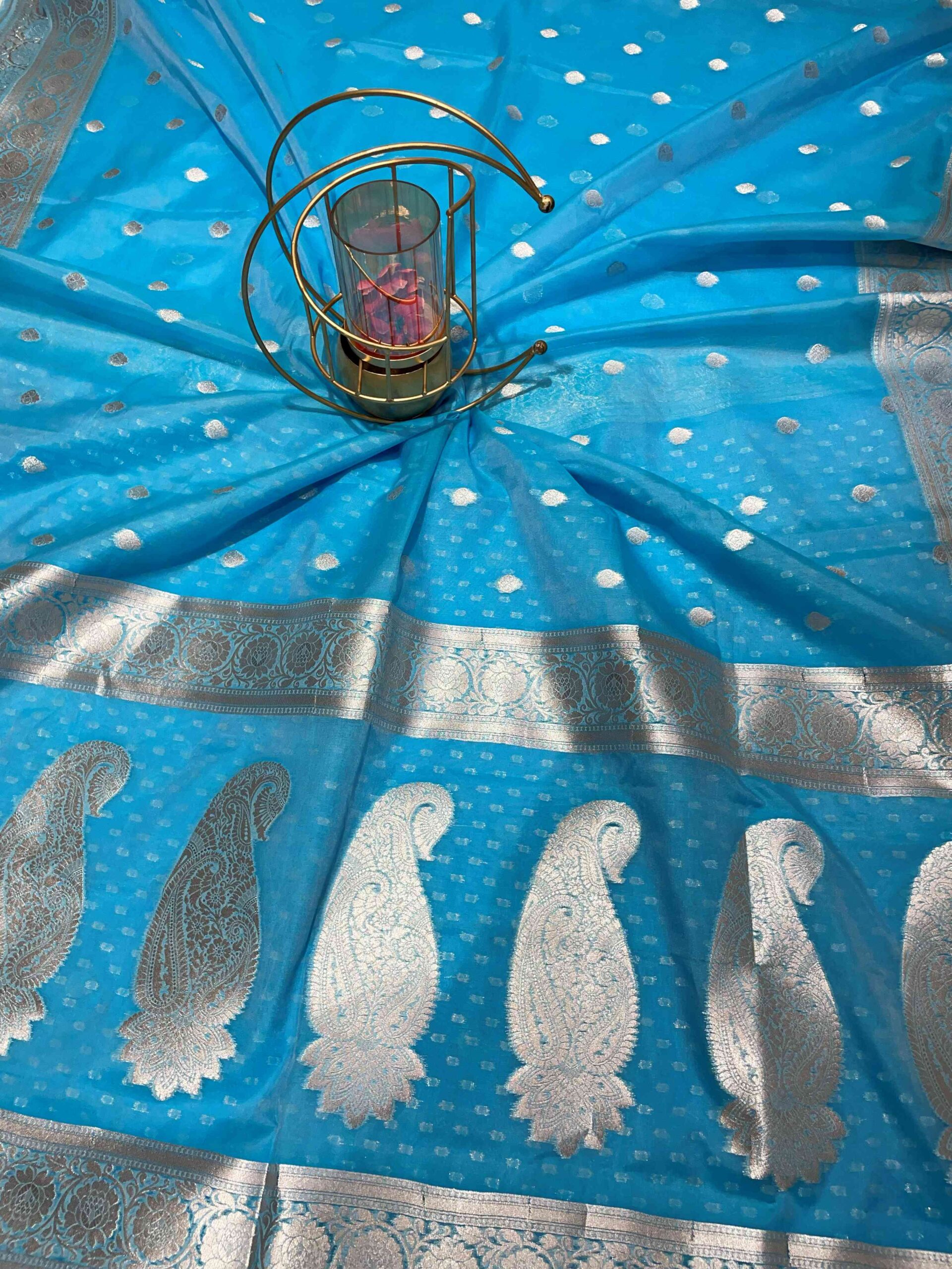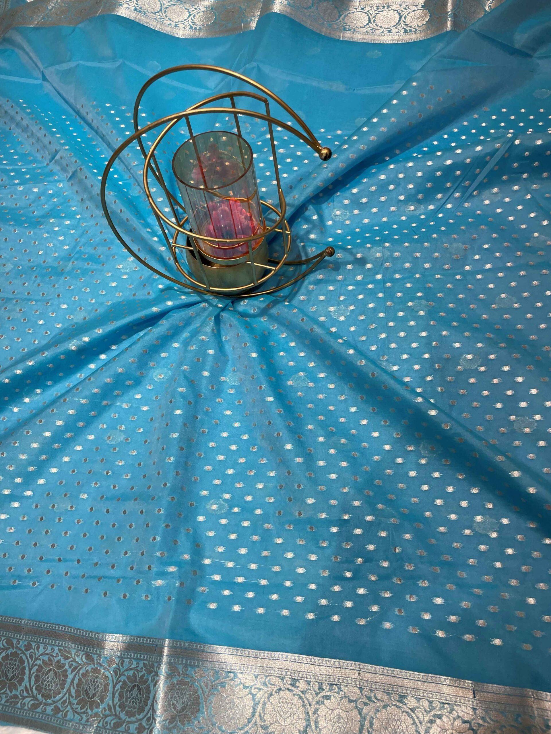 Turquoise Blue Cotton Linen Silk Saree with Silver Zari Buti
