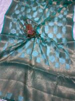 This exquisite pure Banarasi silk saree showcases a stunning turquoise green base adorned with magnificent golden zari weaving throughout. The saree features traditional Banarasi craftsmanship with an all-over pattern of intricate diagonal bands running across the fabric, creating a distinctive geometric design that catches the light beautifully. The body is embellished with elaborate golden zari work featuring large paisley motifs and floral patterns arranged in a striking diagonal pattern. The unique checkered effect is created by alternating bands of dense zari work and sheer silk, giving the saree a dimensional texture and luxurious appearance. Small delicate butis are scattered across the fabric, adding subtle detailing to the overall design.